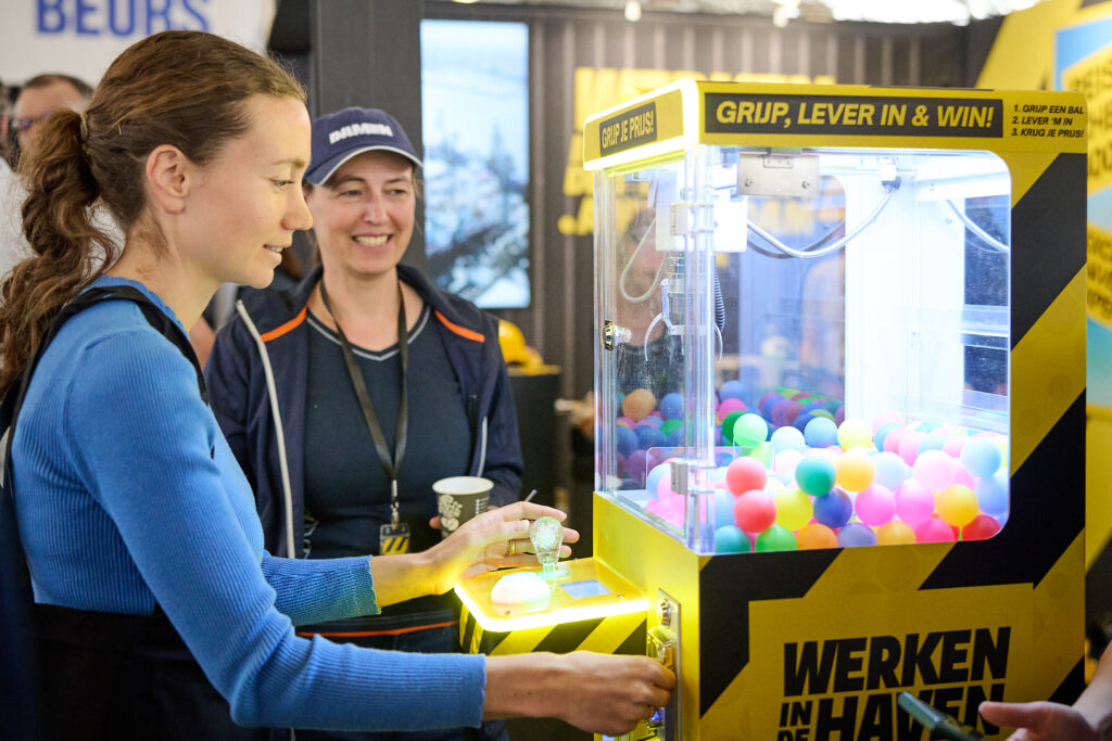 Zoals je van Werken in de haven Amsterdam gewend bent, vallen we weer heel erg op met onze geel-zwarte stand en de ‘Grijp je kans-automaat’. In aanloop naar, tijdens en na de beurs zijn we ruim aanwezig op social media. Op weg naar 1000+ leads voor de haven!